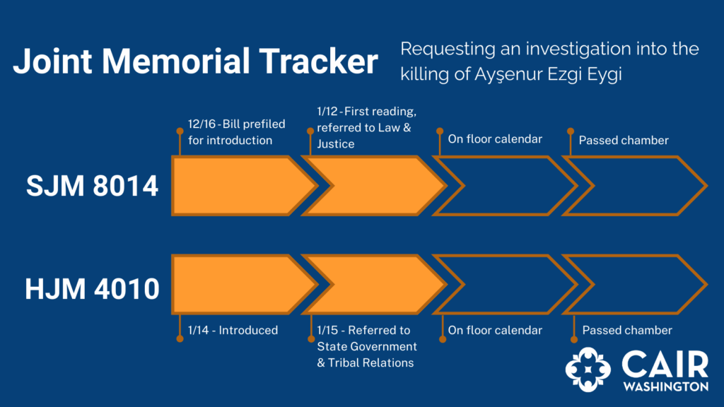 - A senate joint memorial like SJM 8014 would be delivered to the US Congress on behalf of the state of WA legislature and would call upon them to request an investigation into Ayşenur’s killing.